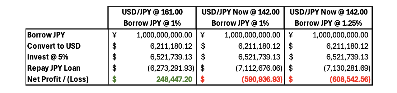 Interest rates in Japan have been extremely low for quite some time, and investors have been borrowing money in Japanese Yen, converting that money to U.S. Dollars, and investing in U.S. markets to earn a higher return than their cost of borrowing. This has become more prevalent as of late, with the risk-free rate on U.S. Treasuries rising substantially over the past couple years. For example, if an investor borrowed the Japanese Yen (JPY) at a 1.0% interest rate, converted it to U.S. Dollars (USD) at an exchange rate of 161 JPY per 1 USD, and invested in USD at a 5.0% interest rate, they would expect to make a 4.0% return, assuming they could exchange dollars for yen at the same rate of 161 JPY per 1 USD and repay their debt in yen. However, if the exchange rate moved against the investor and they could only exchange dollars for yen at a rate of say, 142 JPY per 1 USD, they would incur a net loss due to unfavorable exchange rates and a loss on currency exchange (approximately 11.8% currency loss) in excess of the interest rate differential for 4.0%, resulting in a net -7.8% loss overall. This loss would be further compounded if the borrowing rate in Japan were to rise above 1.0%. An illustration of the hypothetical scenario in dollars is below: